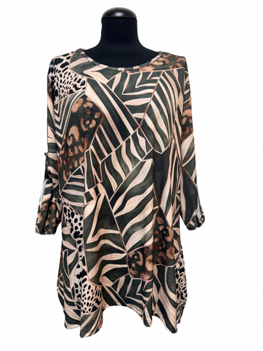 Tunika v izrazitem A kroju, UNI vel. do 52/54, Z OLIVNIMI VZORCI
